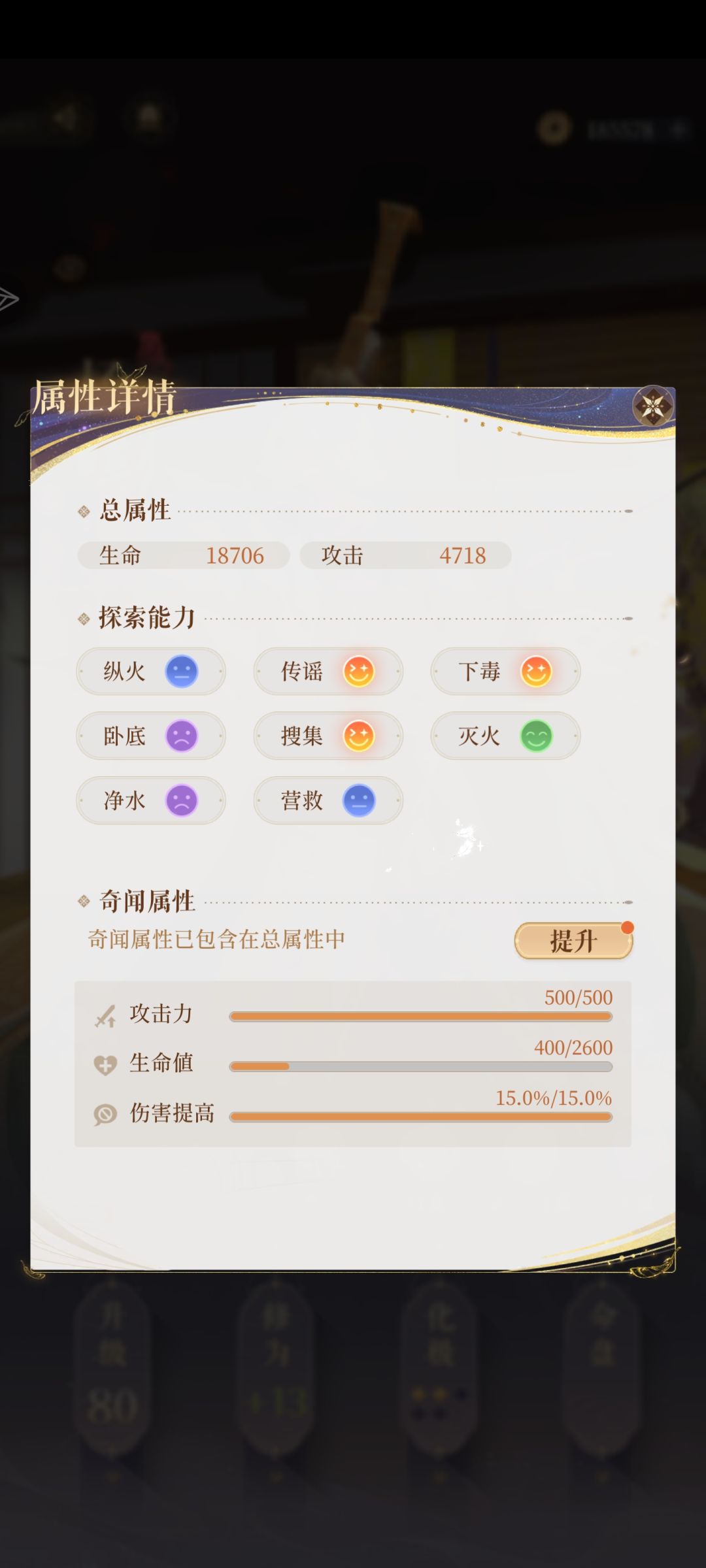 点密探属性页的详情就可以看到这个密探可以喂哪些属性(生命/攻击/攻击加成/伤害减免/治疗加成)
