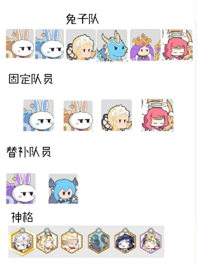 神格推荐:如图,重新分配了下,兔子队不怎么缺输出,放一个烧血足以,双复活增加下容错率,其余凑数。