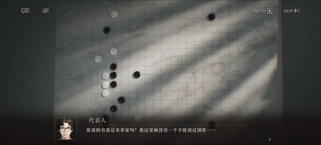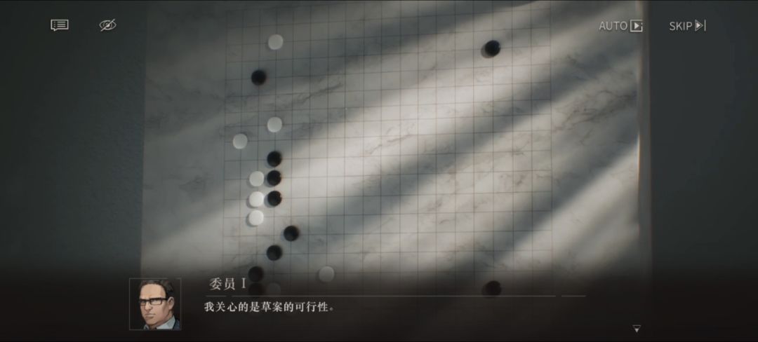 然而面对黑骑在上方的外势,白棋非常无理地点在非常近的地方限制黑棋向上发展的空间,对应咖喱味很重的佩德拉对马克的当众挑衅。马克的四路尖冲是常规的应对方式,压制白子逃向棋盘中部的路线,对应他接受挑战表明态度。佩德拉三路爬出,看似顺从黑棋的战术,其实图谋的是挖空黑棋在边缘的实地。马克没意识到这点,依然连续四路压,形成了面对棋盘中部看似坚固的外势,对应他以为自己能证明“维尔汀的忠诚”就能掌握道德主动权。最后佩德拉一手小飞连接之前布局在四路的那颗白子,让一道白棋掏空黑棋的实地后轻巧脱出,对应他对马克诡辩“风险不是来自维尔汀,而是来自牵动所有人利益的预算分配”,本来未定的中立人群于是大量站到了佩德拉的一边。马克显然沉浸在自己的“伟大叙事”中,被佩德拉这一手看似卑微但是无懈可击“二路小飞”打得猝不及防,只剩下一道无用的外势,这时候理论上他应该放下这块的失策,利用交到自己手中的先手权去别处谋划,但他依然觉得“你没看我的提案,我从来没讲到预算的问题”,很古怪地在那条黑棋链上方没多远的地方落子“补形”,但自此他连先手都失去了。