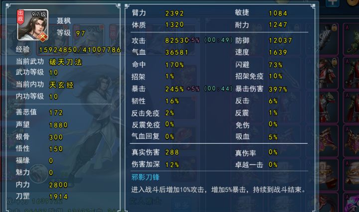 )剑主天佛,阿飞峨眉a剑,也是减防的。第一个关键条件阿飞速度>聂风,这点大家可以想办法加一下速度,逢魔村丹药什么的,宝石。第二个关键条件是阿飞血量足够多,把ss腰带给他,然后弄韧性,我这里好像是70多韧性,抗住下路一拳不暴击不死。