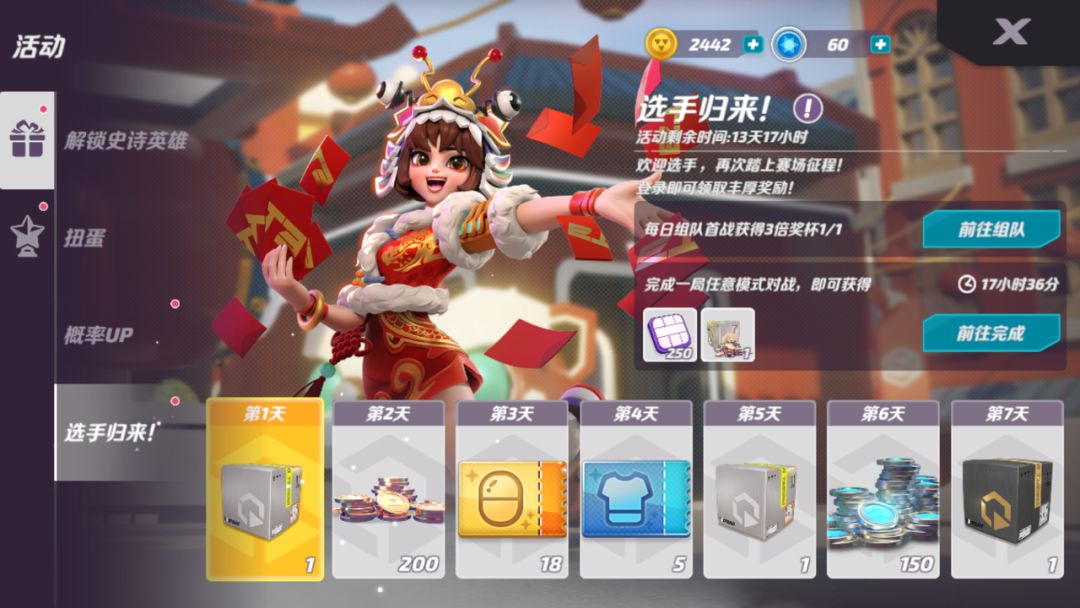 ■ 活动说明:超过30天未上线的选手再次上线时,可通过完成额外的登录奖励和回归任务获得【扭蛋券】、【超级补给箱】、【皮肤碎片】等丰富奖励。