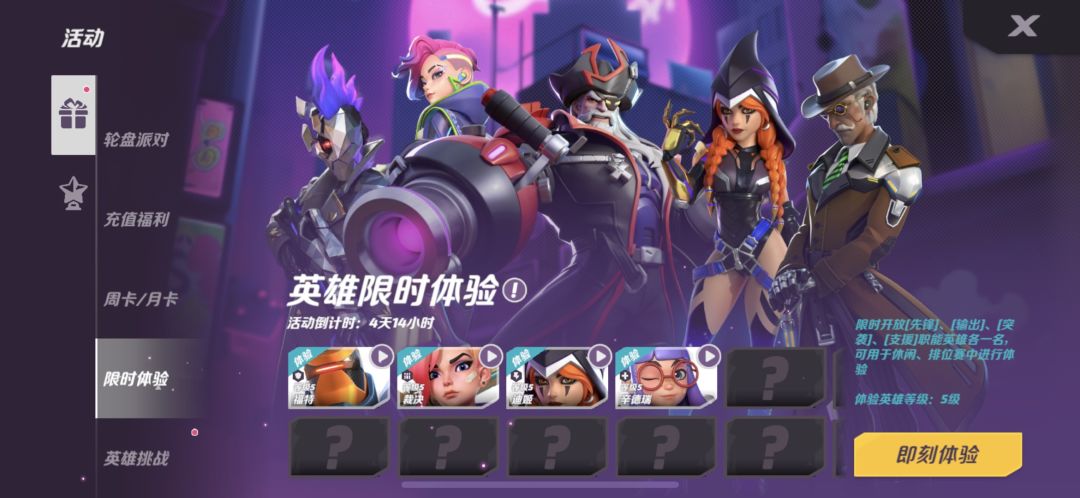 ■ 活动说明:限时开放不同的[先锋]、[输出]、[突袭]、[支援]职能英雄各一名,可用于休闲、排位赛中进行体验。