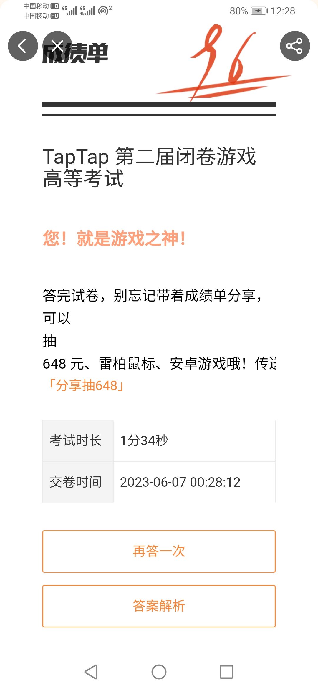 虚假的96分,真正的72分。其实都是蒙的比较多,惭愧惭愧。下面我对我知道的题目解析一下。![[TapFamily_跳舞]](https://img.tapimg.com/market/images/e60f8064b5fe2d624e84942db93208a6.gif)