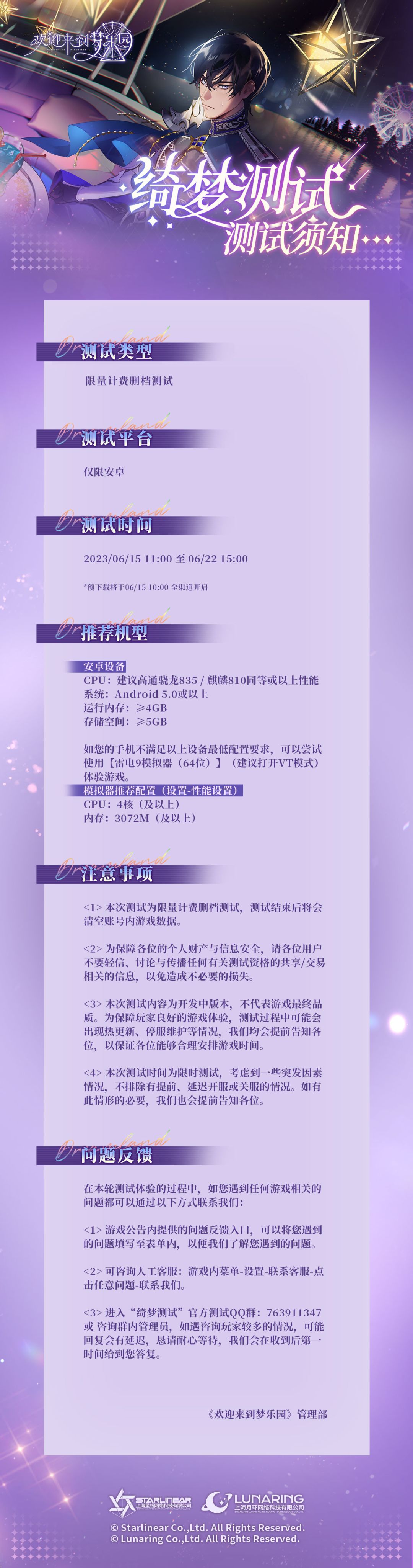 管理者您好,"绮梦测试“将于2023年6月15日11:00准时开启。为保障您的测试体验、便于您进行测试问题反馈,请您仔细阅读下图测试须知。