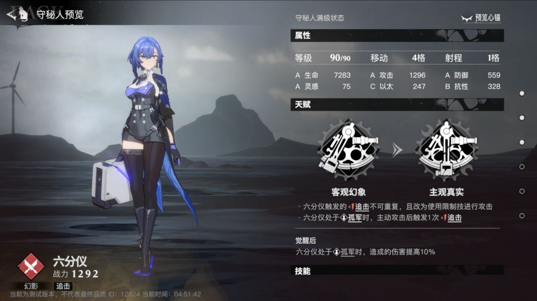 六分仪作为一个新手池里面的自选角色,开荒作用是最为突出且泛用的新手池角色。本身不俗的追击+限制技的联动伤害,前期不需要高昂的S残响即可触发追击。面板属性也是幻影职业中是数一数二的存在。一破下的六分仪是开荒作战中最具有性价比的角色,自身具有高昂带来的双暴增益,擅长单兵作战以及点杀敌方单位。