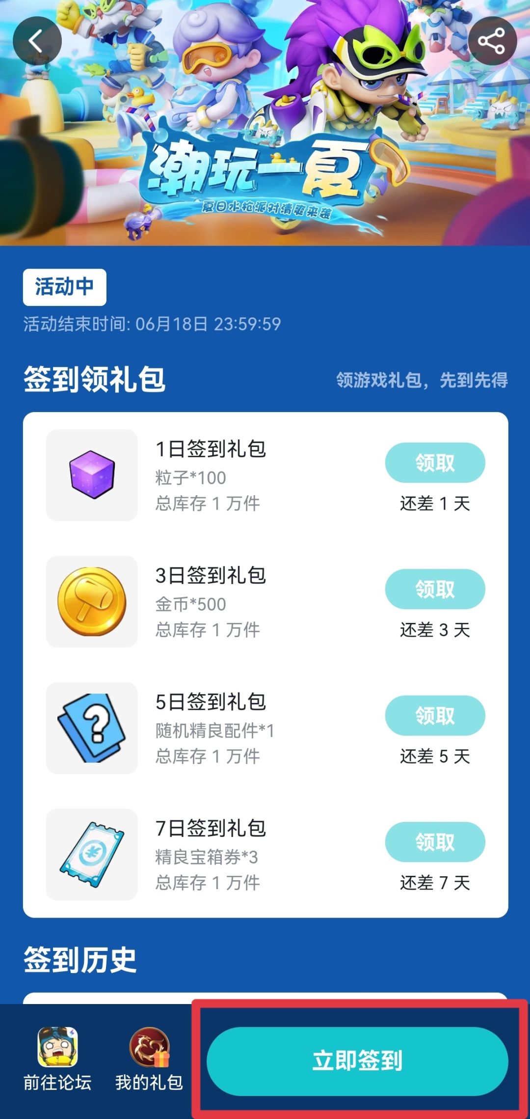 2、在本页面点击「立即签到」,活动期间内累计签到满对应天数即可获得相应奖励,礼包先到先得,领完为止。3、点击对应礼包即可成功领取礼包码,活动礼包一个账户仅可获得一次。