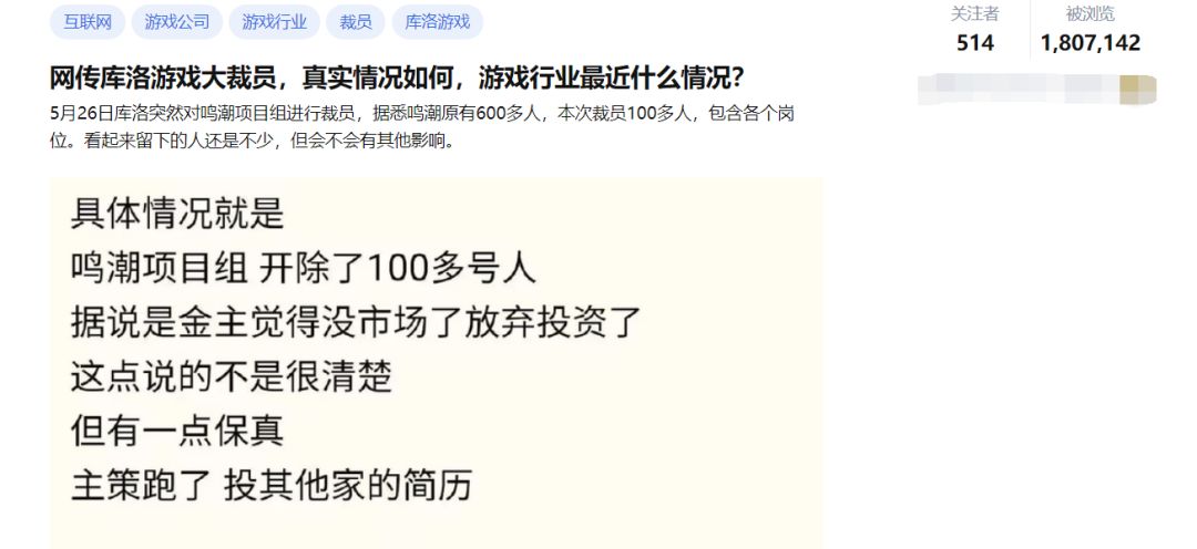 近几天,有关库洛游戏「大规模裁撤员工」、「《鸣潮》项目组解散」、「腾讯/英雄游戏撤资」等言论在多平台流传发酵——其中仅知乎相关问题就有180万浏览量。