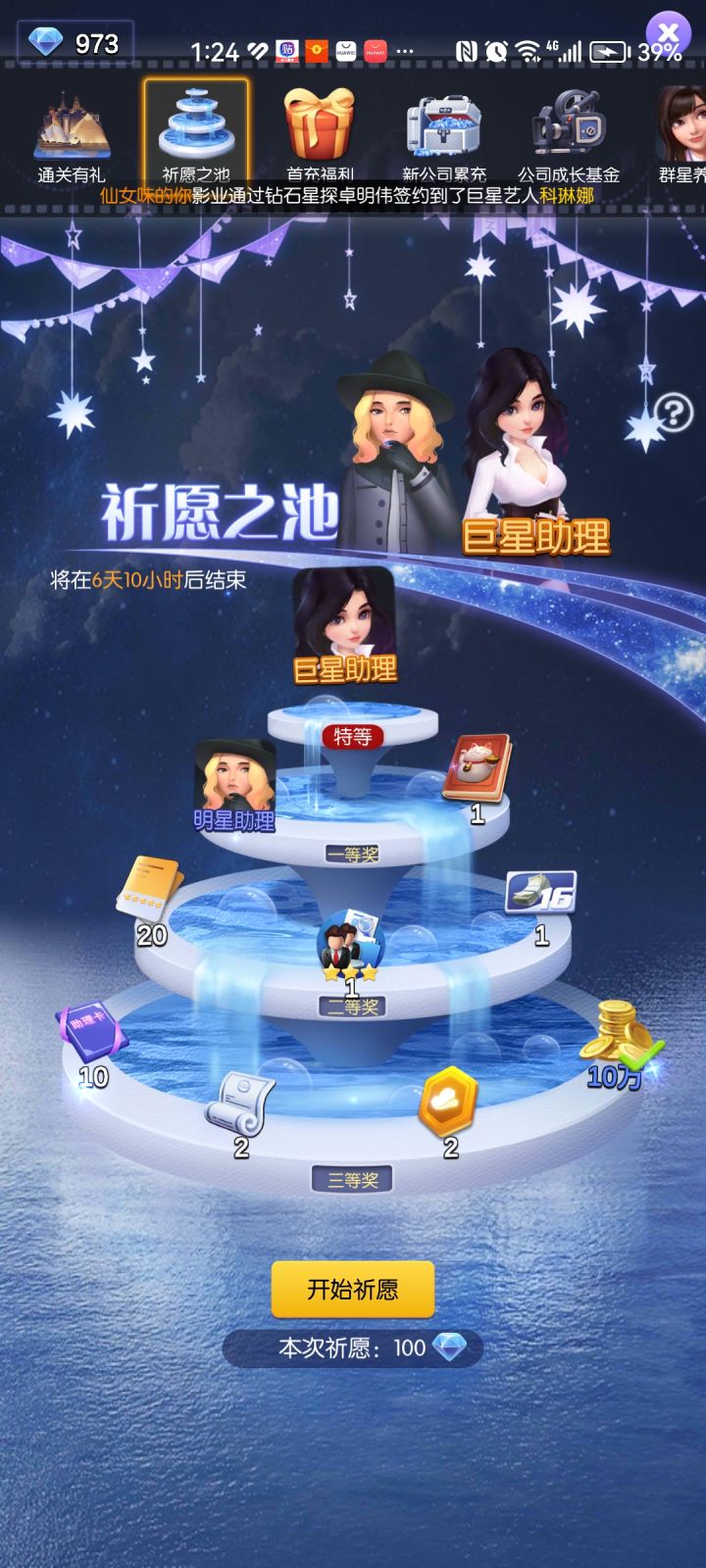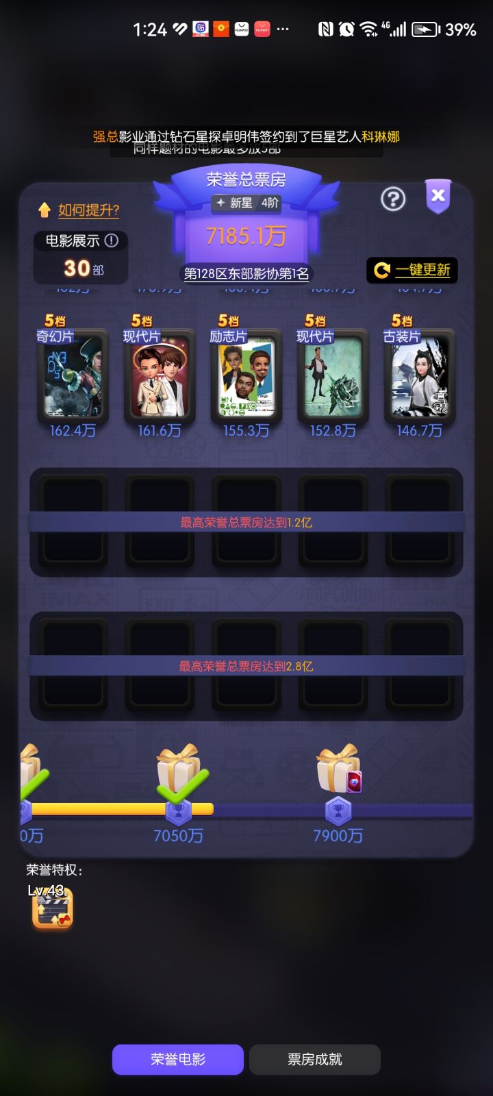 升7档准备事项:尽量的吧你的荣耀票房提高得buff,基本上冲7档都是9级公司玩家,编剧已开,那么各位切记去招募编剧,银编剧起但别培养,只是为了简单改编下剧本,编剧卡留着后面招募金编剧。同时各位也尽可能的把爬塔通关打高,目地是为了得资源上了20层可以免费得个明星当助理,也可以兑换资源。基本上你战争有一个巨星是70级的剩下俩到3个是60的你把这些准备工作做了,你就可以冲7档了。