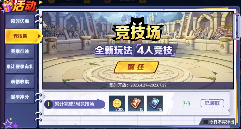 1、累计完成3局竞技场,可获得2000猫币。只能获取1次~