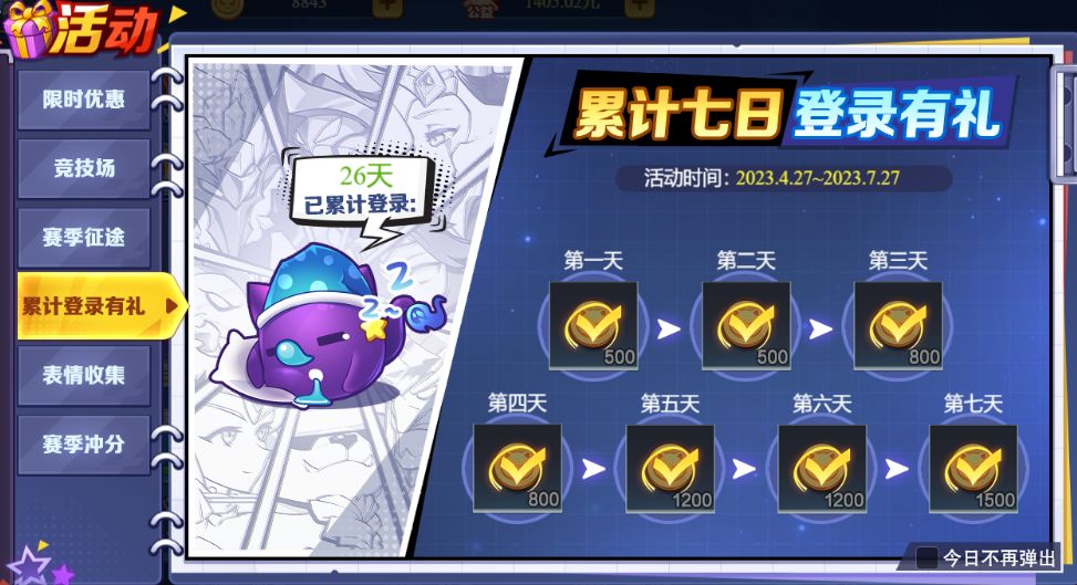 3、累计登录有礼,累计登录7天,可一共获得6500猫币。
