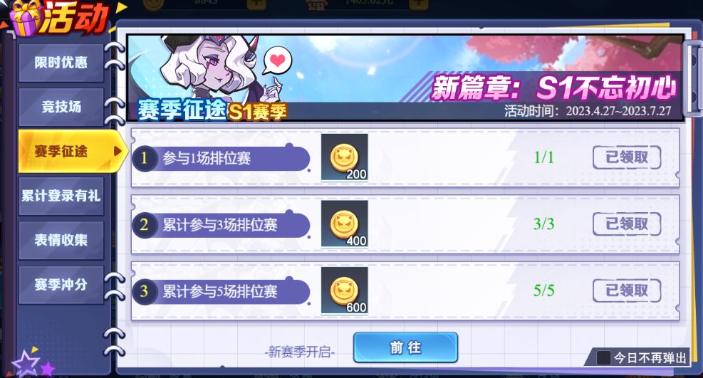 2、赛季征途,累计完成5场排位赛,可一共获得1200猫币。