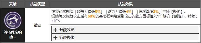 算一个锦上添花的天赋,60%的基础概率太低,银狼还没有弹射机制,也是个不堆命中就可以当没有的东西。且三种效果随机附加,虽然理论上可以给同一个怪物施加三种不同的缺陷,可一个缺陷仅持续3回合也奠定了三种缺陷共存的覆盖率必然不高。这被动真的想变成决定因素的话,得升级到满级才有可观提升。