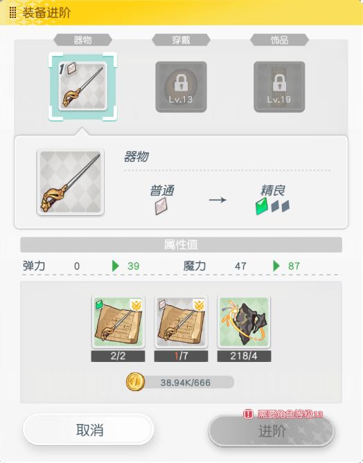 角色装备总共分为武器、防具、饰品三种,每个装备都可进行升级以及进阶