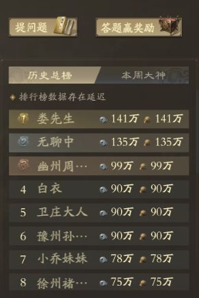 1、我们将拉取主公们在尚书台内参与问答及回答采纳的数据,活动结束时综合评分前5位的主公将会在本贴展示并获得互助好礼。