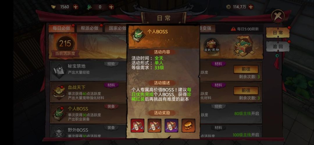 个人boss是基础日常任务,其难度还是蛮简单的,建议每日优先完成,获得珍稀装备后再挑战其他有难度副本哦。