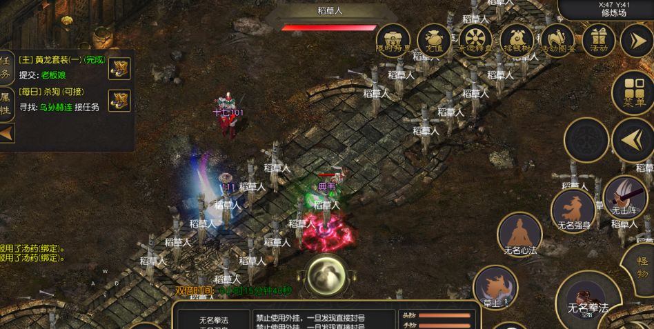 8、注意:到达长城以南后,建议先去修炼场把无名槌法修炼满级,修炼场时间需要使用包裹内修炼场加时卡获得,修炼场在长城以南船夫521:477处传送进入,如果获得首充奖励的玩家,优先将无机阵修炼满级,前期最强打怪武功,有此武功从此事半功倍。将任意武功修炼满级后再去做后续任务会轻松很多。(这里推荐大家有条件的可以买个月卡,每天送240分钟的修炼场时间)