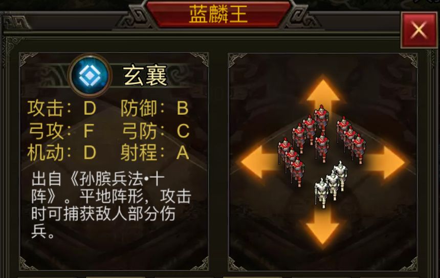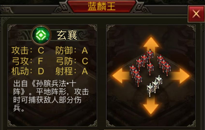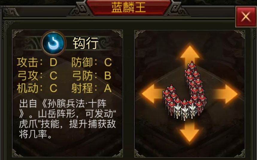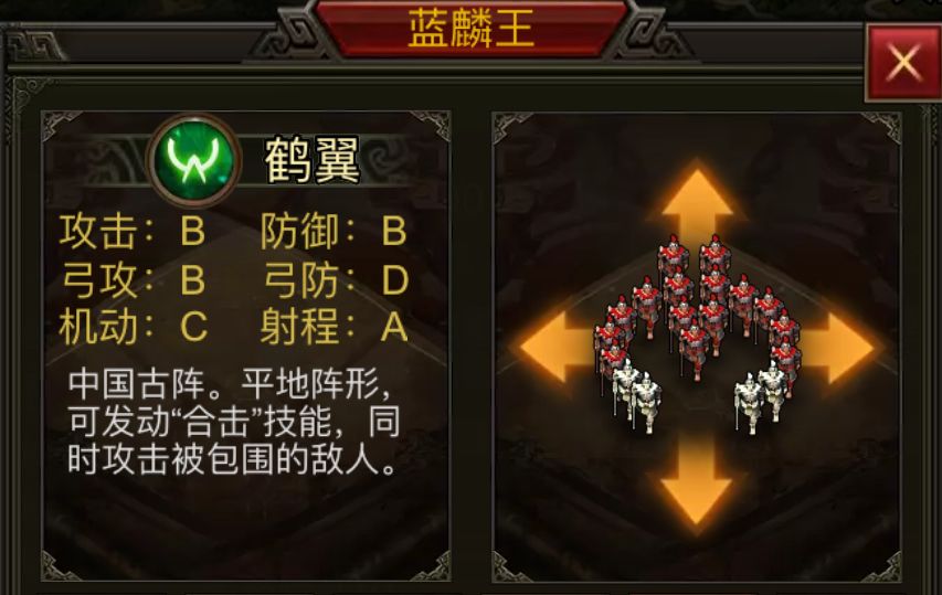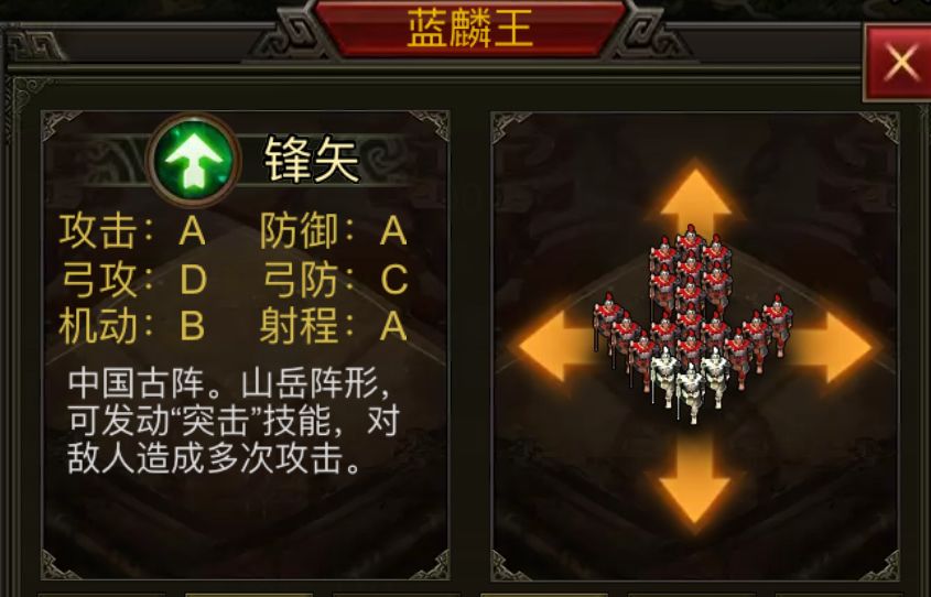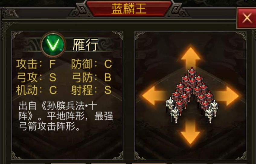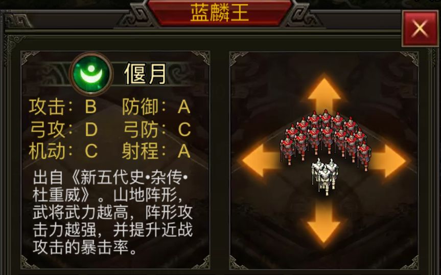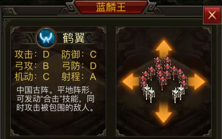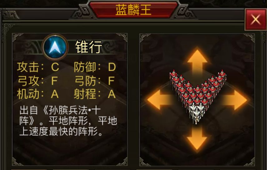 阵形介绍:增加部队暴击率(受武力影响)可触发单挑