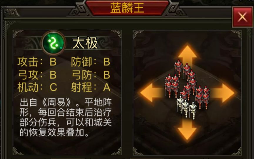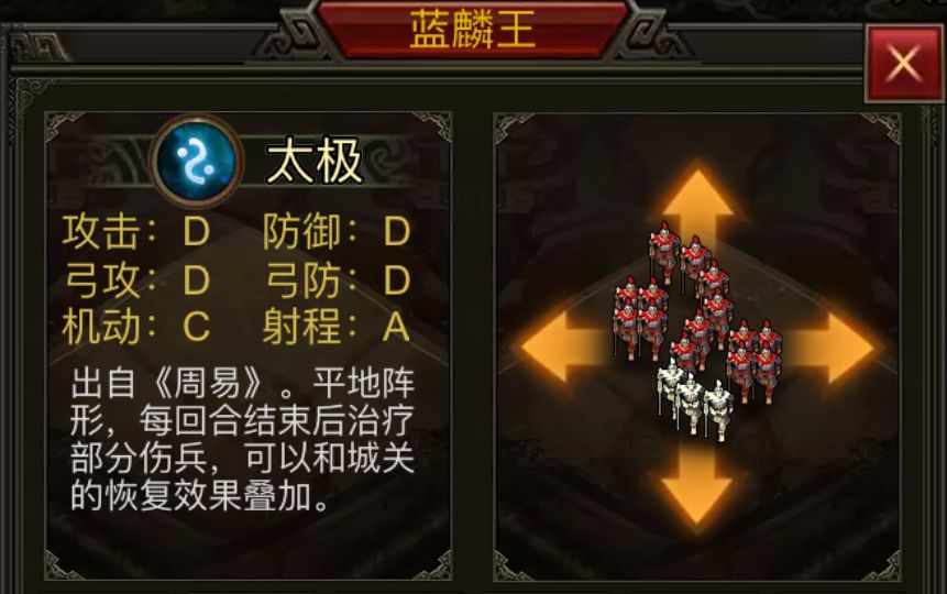 阵形介绍:回复伤兵效果,与城关效果叠加(受智力影响)
