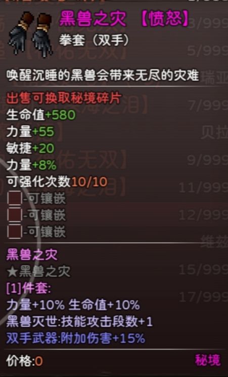 每个秘境总共有6件(最下面的图),打完秘境BOSS开箱子有几率出,秘境开箱子出的装备出的装备又有几率出后缀词条,比如图中的愤怒词条就加了8%力量,这些词条在游戏内的百科中有写。