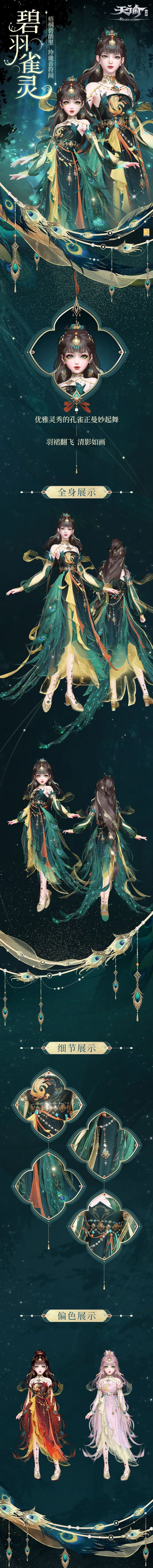 梧桐碧荫里,玲珑音符间,优雅灵秀的孔雀正曼妙起舞, 羽裙翻飞,清影如画。——全新时装“碧羽雀灵”上线。