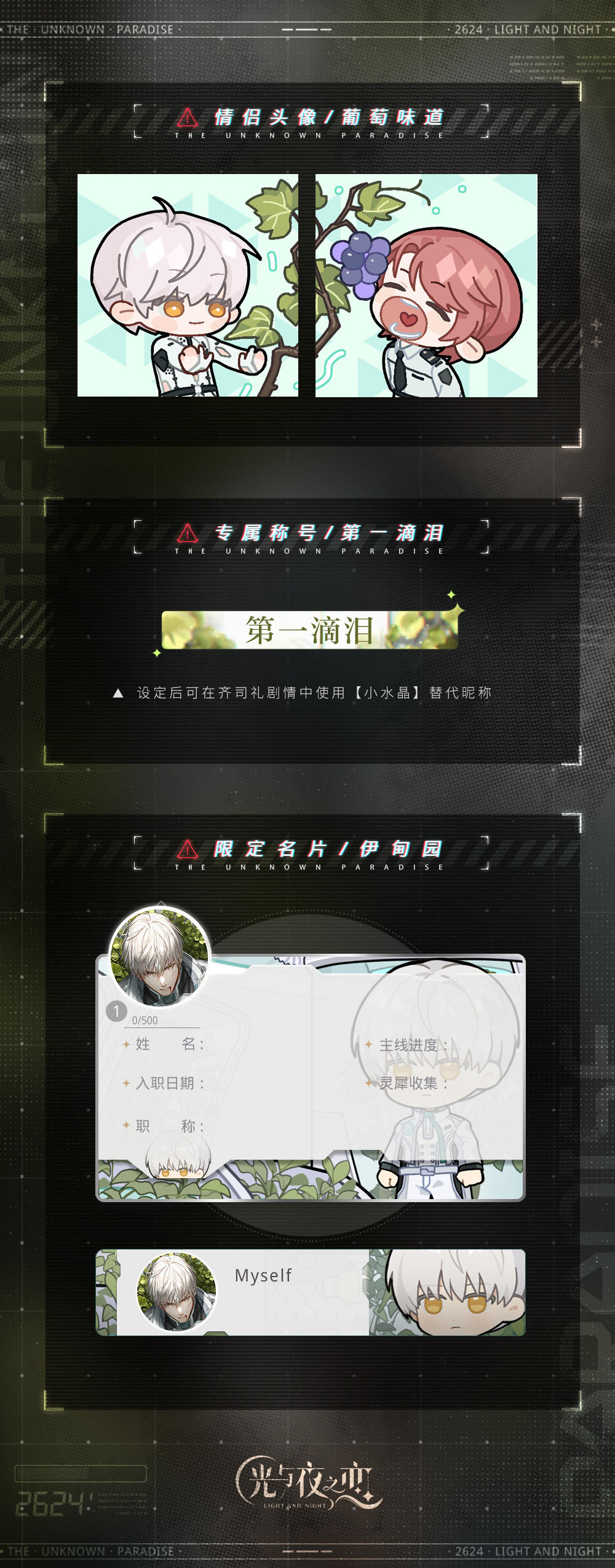 活动期间累计收信210次/240次/270次/320次/350次时,各可在限时计划处领取[名片礼盒],打开后可随机获得以下任一限定名片奖励:[末日纪] [诀别歌] [伊甸园] [命运书] [诺亚舟](不会重复获得)。