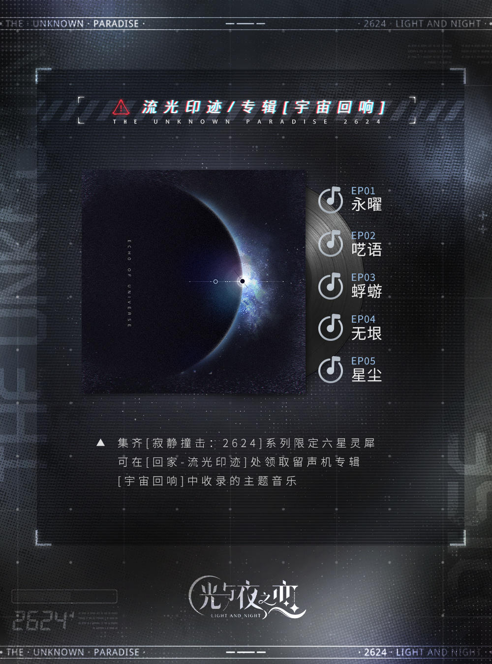 集齐[寂静撞击:2624]系列限定六星灵犀,可在[回家-流光印迹]处领取留声机专辑[宇宙回响]中收录的主题音乐[永曜] [呓语] [蜉蝣] [无垠] [星尘]。