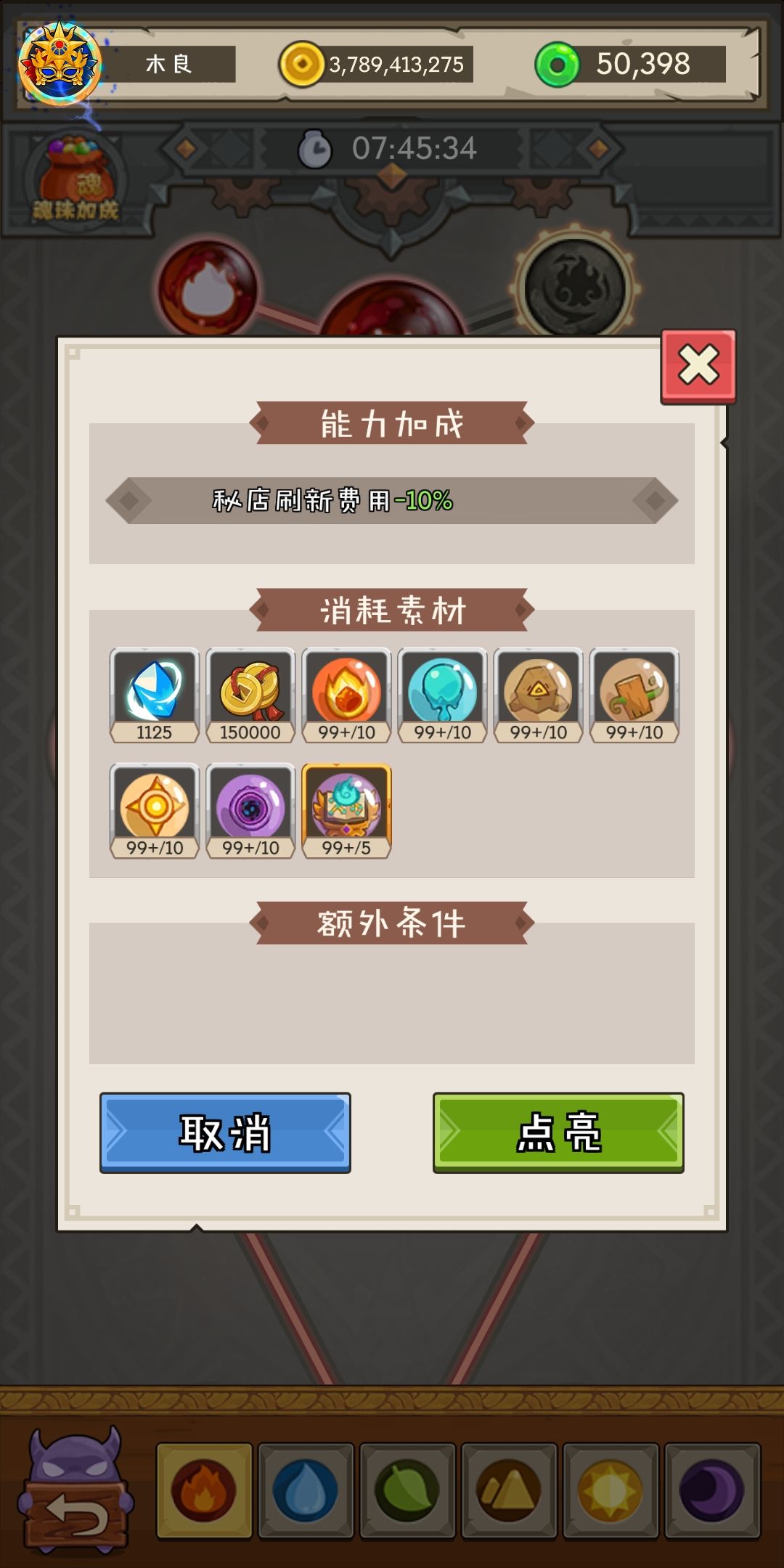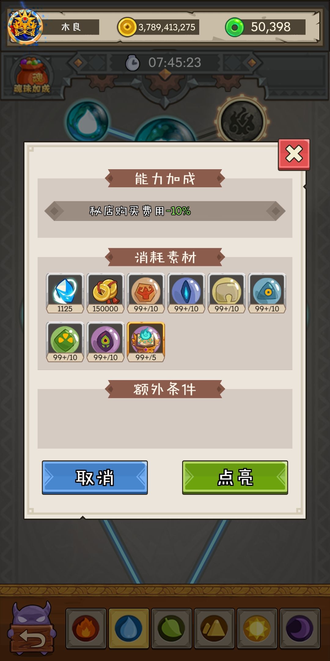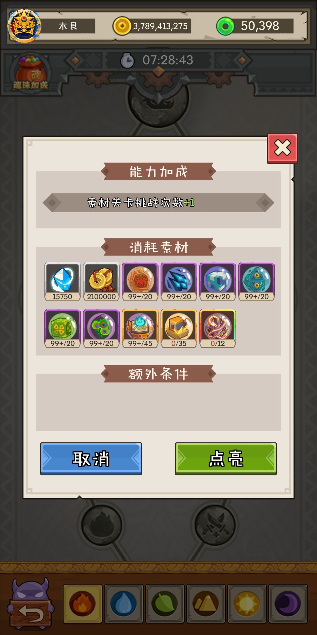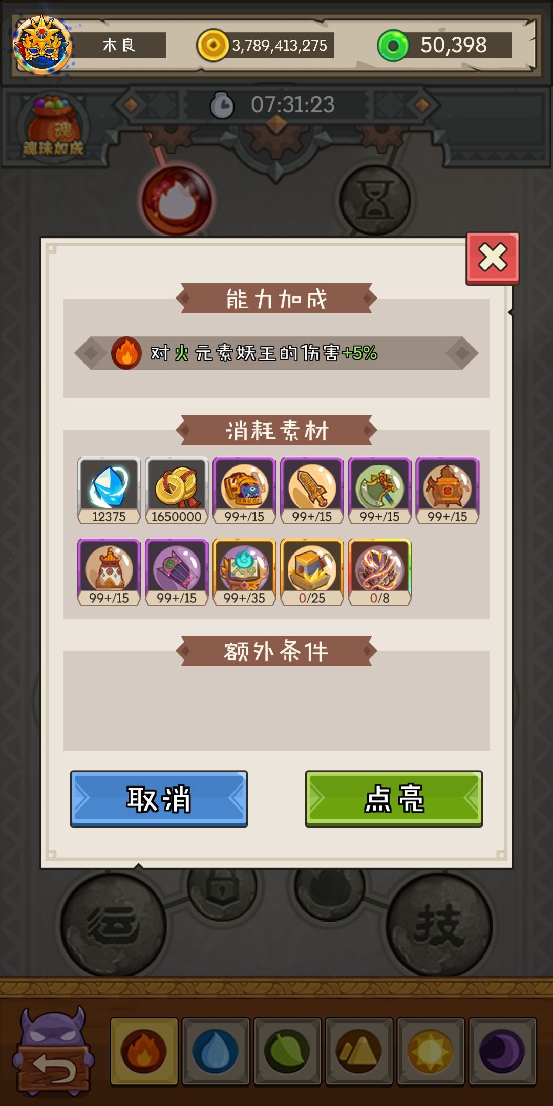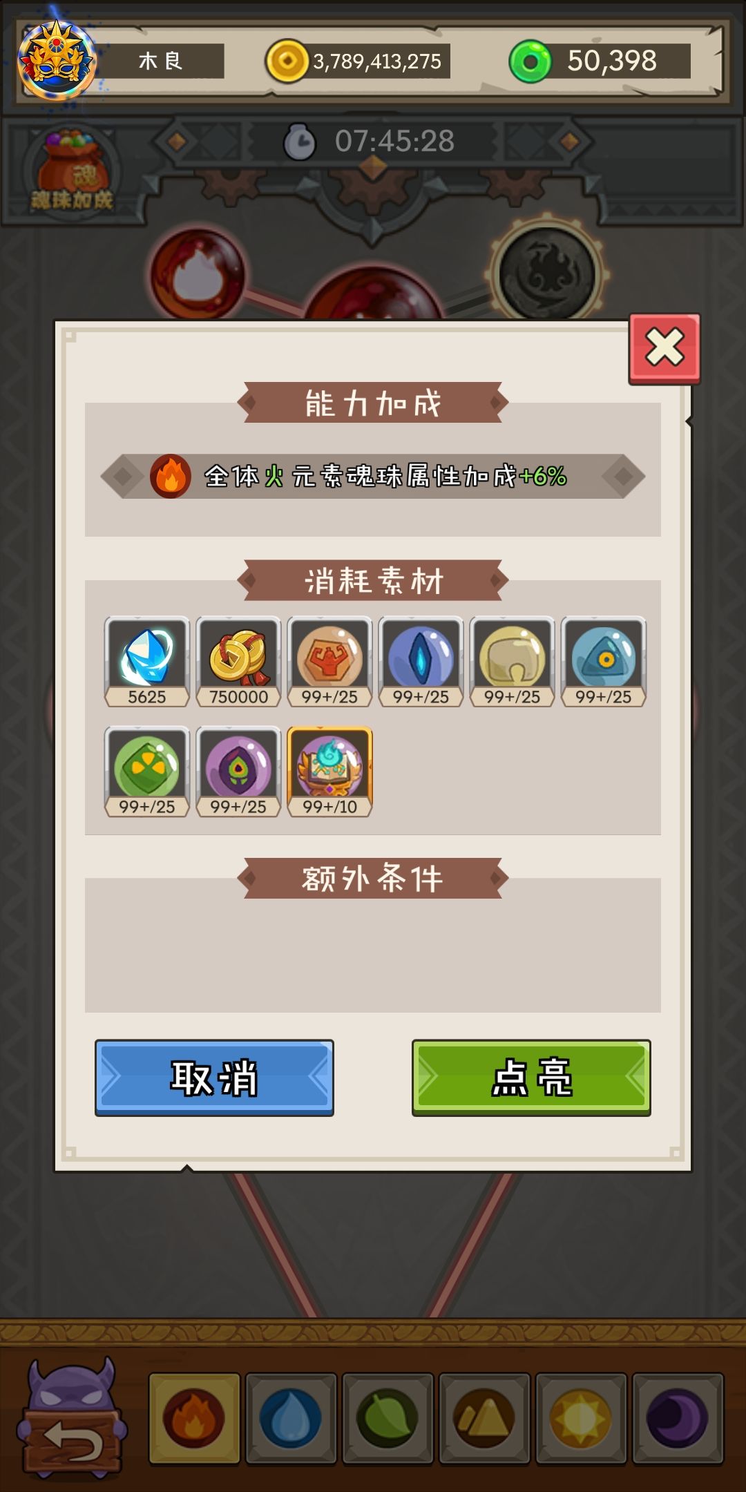 最后是最重要的,优先点火和木元素!因为可以增加挂机次数!为什么不点其他的?因为水土光都是未开放!暗这里是解锁一个船位!这游戏的核心不就是挂机收菜!有什么魂珠的优先级能比这个高!