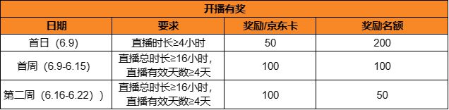 首周开播奖:活动首周(6.9-6.15),在专区开启直播,完成直播总时长≥16小时,直播有效天数≥4天(直播时间≥2小时为1个有效天数),真实人气ACU≥1的主播,可获得开播激励奖,名额设置100名,超出名额按照主播真实人气排名发放,可叠加其他奖项获得。注:要求每日(晚20:00-晚22:00)直播不低于1小时。