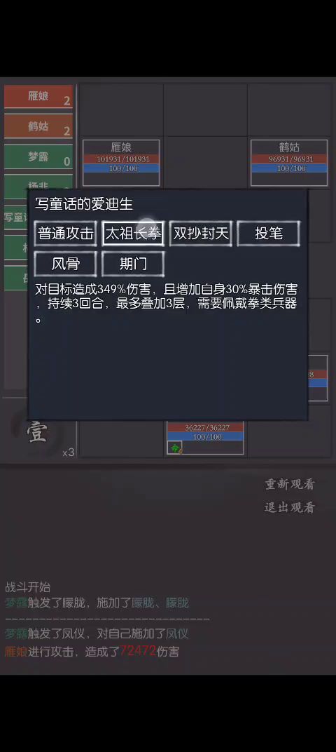降低武免(对单) 功能跟太虚拳(江湖武学)差不多 太祖打最近 太虚是打血最多