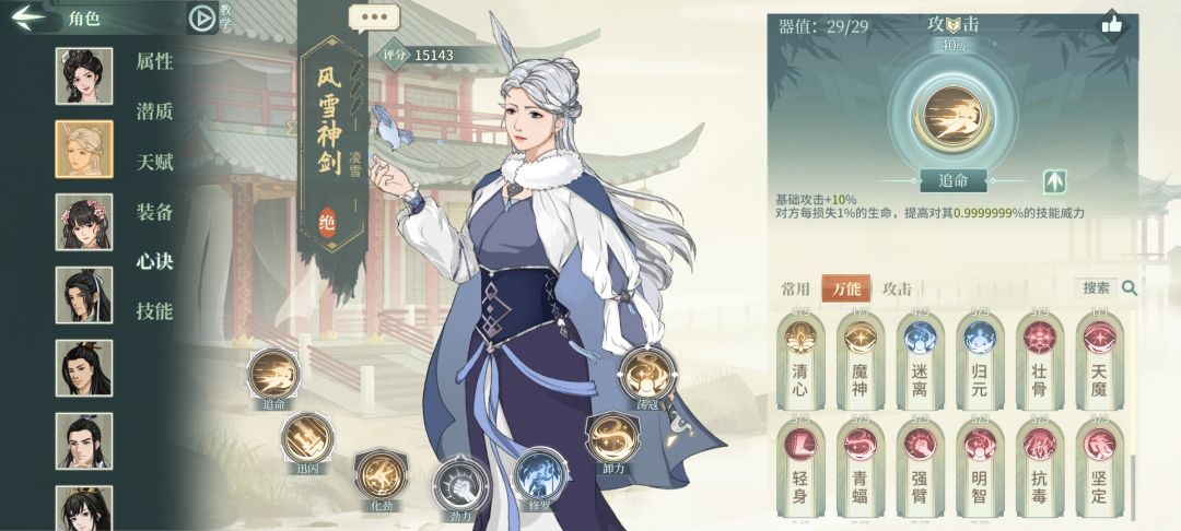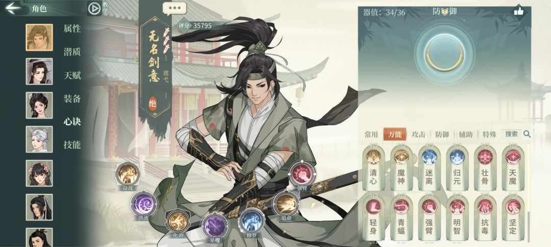 然后是上述侠客的装备和心决图(只能发9张图片,主角装备我就不发了,说一下就行了,易水寒三件套,蚩尤魔甲,天枫古屐.千锻,真.流氓刀,六周年活动换万炼铁打造)装备防装优先洗减暴击伤害,防御强度,根骨,定力,各种抗性。输出侠客的饰品武器优先洗基础攻击,暴击伤害,暴击概率,技能威力,臂力,命中率。辅助侠客饰品武器洗辅助词条,命中率。好了准备工作完成,就可以进本了![[嗒啦啦2_起了杀心]](https://img.tapimg.com/market/images/347f4af191f7dbd436f74aabcf4616a9.gif)