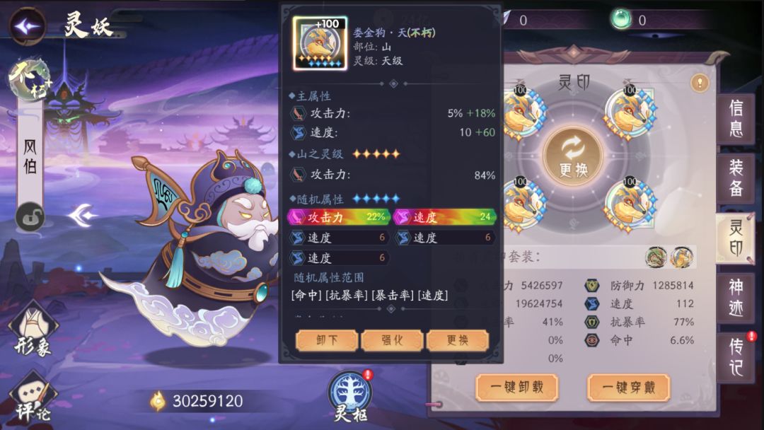 4、佩戴至臻属性灵印的灵妖界面截图