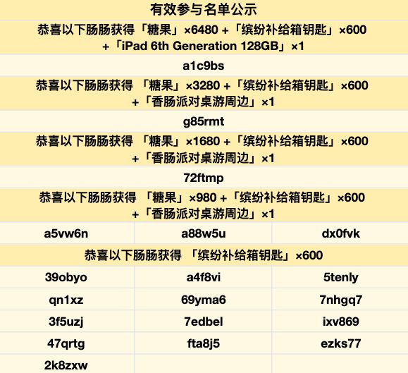 开奖啦~感谢肠肠的热情投稿!下面蛋卷将公布中奖名单~恭喜肠肠获得奖励~糖果与缤纷补给箱奖励将会在14个工作日内发放到邮箱,请注意查收!实物奖励届时请按照邮件内容添加发奖小助手QQ号留言正式服昵称+收件人+联系方式+收件地址领取,同时精选的攻略作品已被移入至SS10攻略精选区,肠肠们可以查看呦~