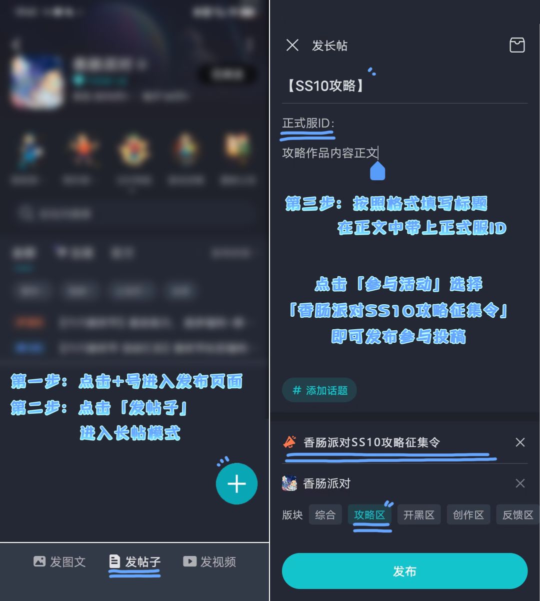 1. 参与投稿必须以长帖的形式发布投稿内容,并且在【参与活动】处选择“香肠派对SS10攻略征集令”;