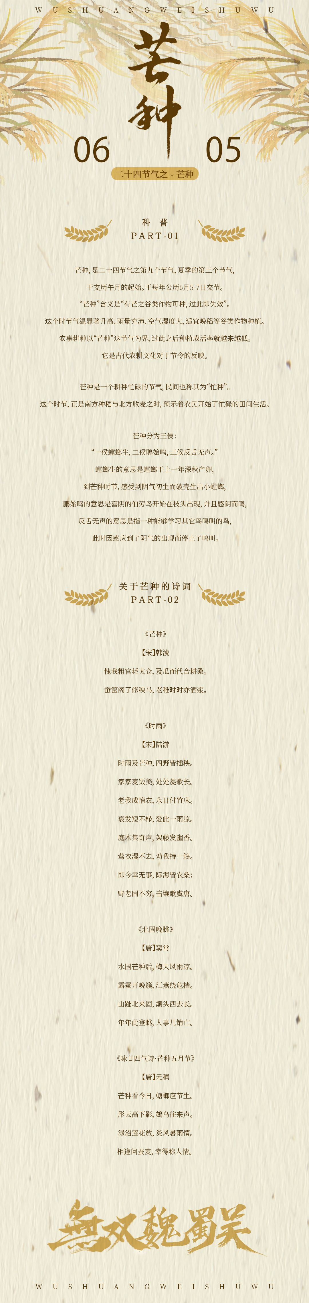 芒种,是二十四节气之第九个节气,夏季的第三个节气,干支历午月的起始。于每年公历6月5-7日交节。