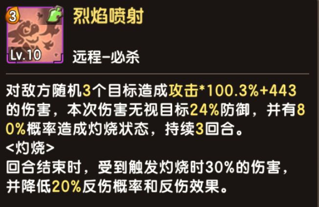 1.火属性-附加效果有概率造成灼烧状态,使状态目标在回合结束时,受到灼烧伤害,并且降低反伤概率和反伤效果