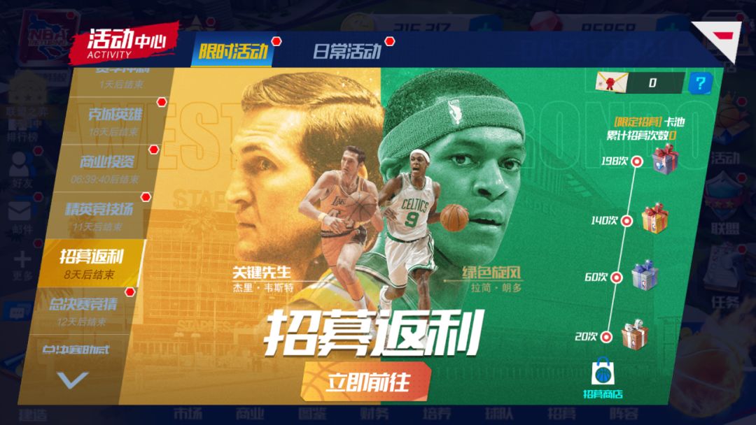 活动期间,将累计经理人在所有使用【巨星招募函】卡池中进行招募的招募次数,招募次数到达一定数量后即可领取进度奖励,奖励中包含巨星介绍信,可用于在招募商店中兑换限定球员。招募至198次,可领取限定球员二选一(限定杰里·韦斯特、限定拉简·朗多)。