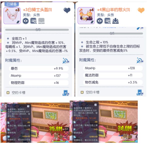 然后再对头饰做个mvp魔物增伤属性的测试,换勾选了mvp属性的家园木桩继续测试