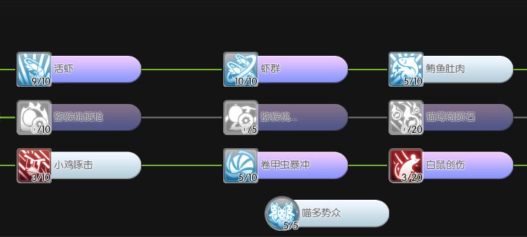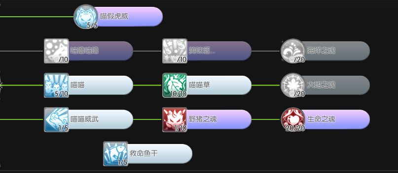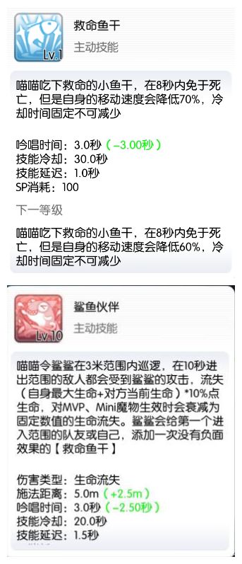 1级救命鱼干:1级就能提供满时间的免死,后续提升降低cd(开先没注意到减cd,点满也不错)和减速debuff,猫的技能不吃移速,作为个站桩懒人我觉得移速不要也罢,况且现在鲨鱼可以提供无debuff的免死,如果需要频繁用到免死可点满