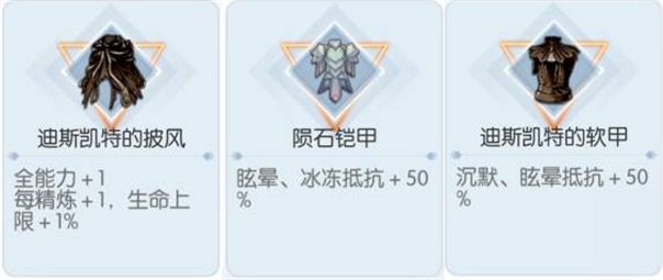 迪斯凯特的披风(最高15hp%)、陨石盔甲/迪斯凯特的软甲(无需精炼,50晕抗)