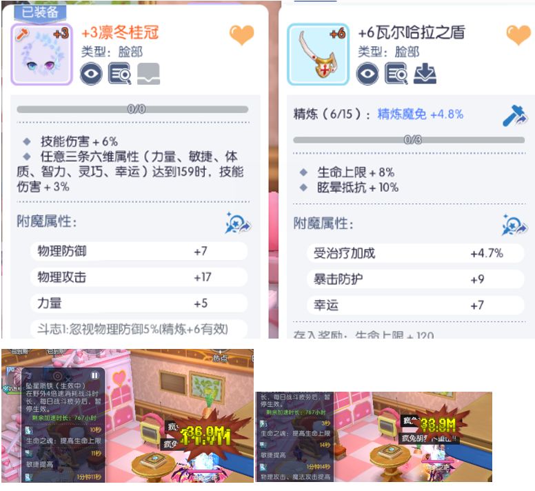 脸部:凛冬桂冠(9技伤,紫色扭蛋)≈+6夜猫子星环(10穿刺,紫色扭蛋)≈萌萌吹风机(15mvp增伤,紫色扭蛋)>捣蛋幽灵与南瓜派(8%hp,蓝色扭蛋)。附魔斗志