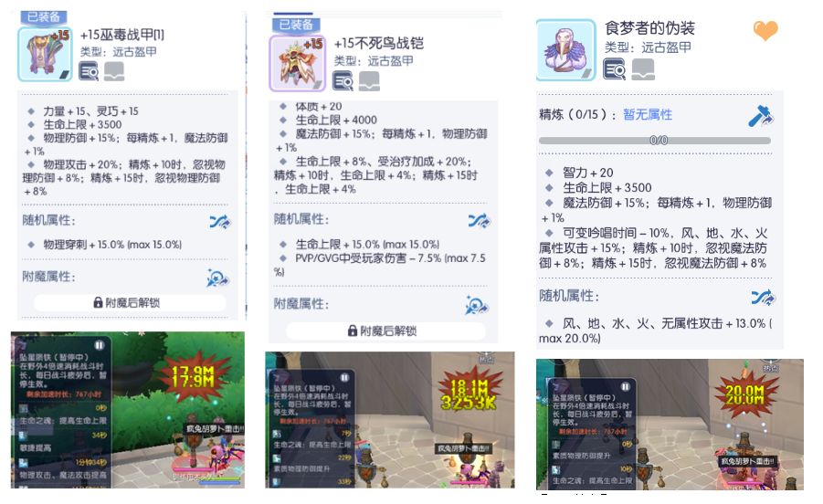 +0彼岸巡行者/食梦者(极限输出)>+15不死鸟战铠/灰烬战甲(偏生存、兼顾海洋)≈+15诅咒战甲/巫毒战甲(堆穿刺)