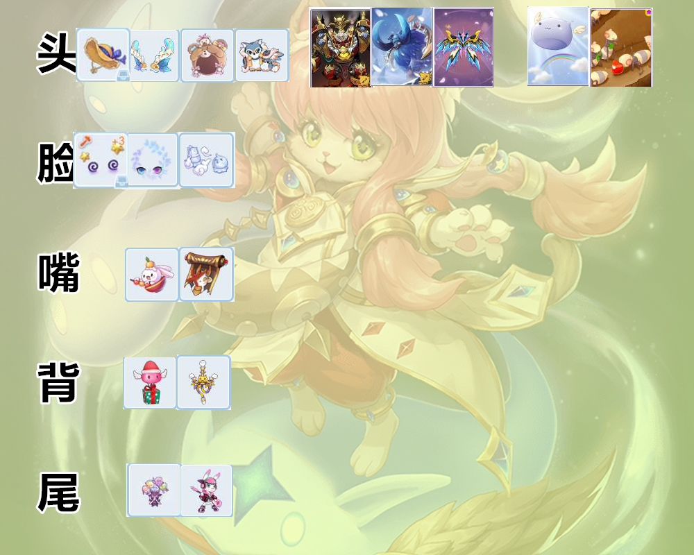 嘴部:蜜糖兔(5技伤+满血时额外3技伤,紫色扭蛋)>重金悬赏(10mvp增伤,蓝色扭蛋)>轻食主义(5技伤,紫色扭蛋)≈贪食小怪(5穿刺,紫色扭蛋)>赛博小兔(8%hp,蓝色扭蛋)。附魔体质或敏捷