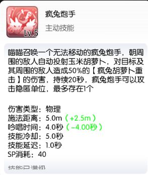 继承50%胡萝卜输出的疯兔炮手持续20s延迟1s,频率1s一次,即持续时间内打20次即炮手1s换10次胡萝卜,暴击率等属性都继承,必带