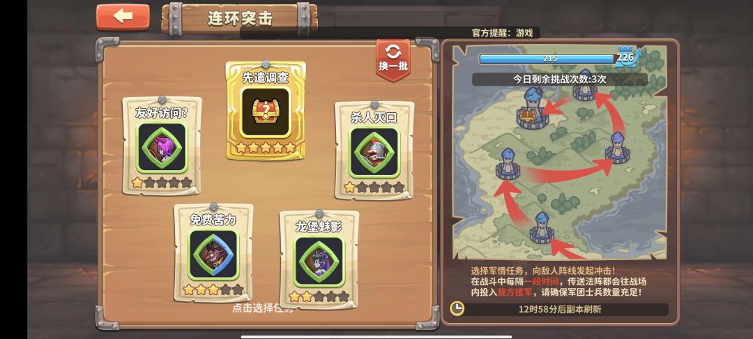 前期选自自己战力接近的打就行,打不过可以继续打,对面的军团不会补血。但是尽量1次通关,通关获取经验书很重要。