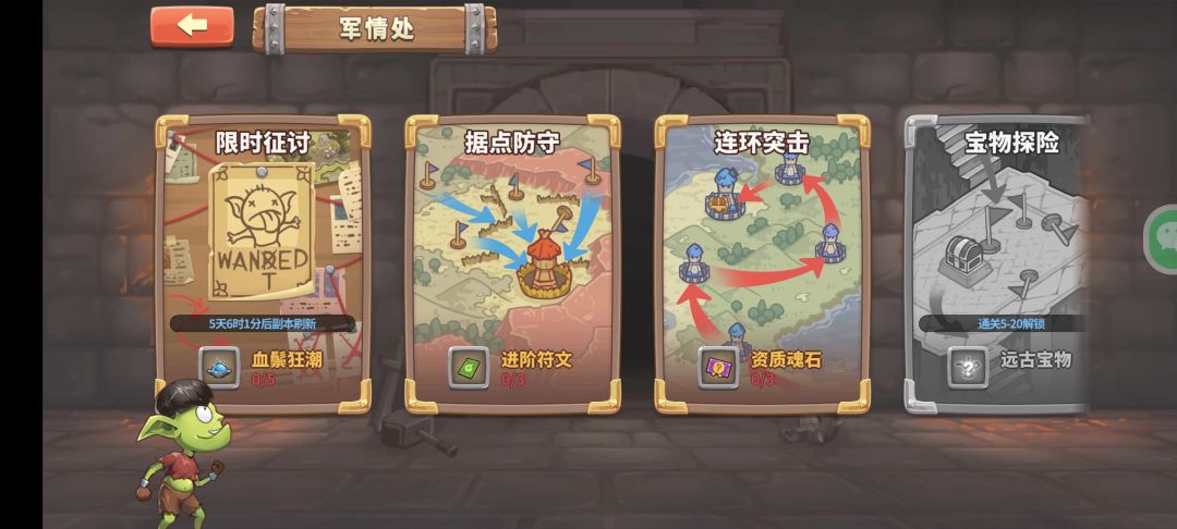 通关第六关以后,可以打进阶挑战,过了进阶挑战后,就能打更高战力的7至12关,7至12关只能用指定的种族打,获取的奖励也更好。对打的种族为:哥布林打魔族——魔族打人族——人族打亡灵——亡灵打哥布林。