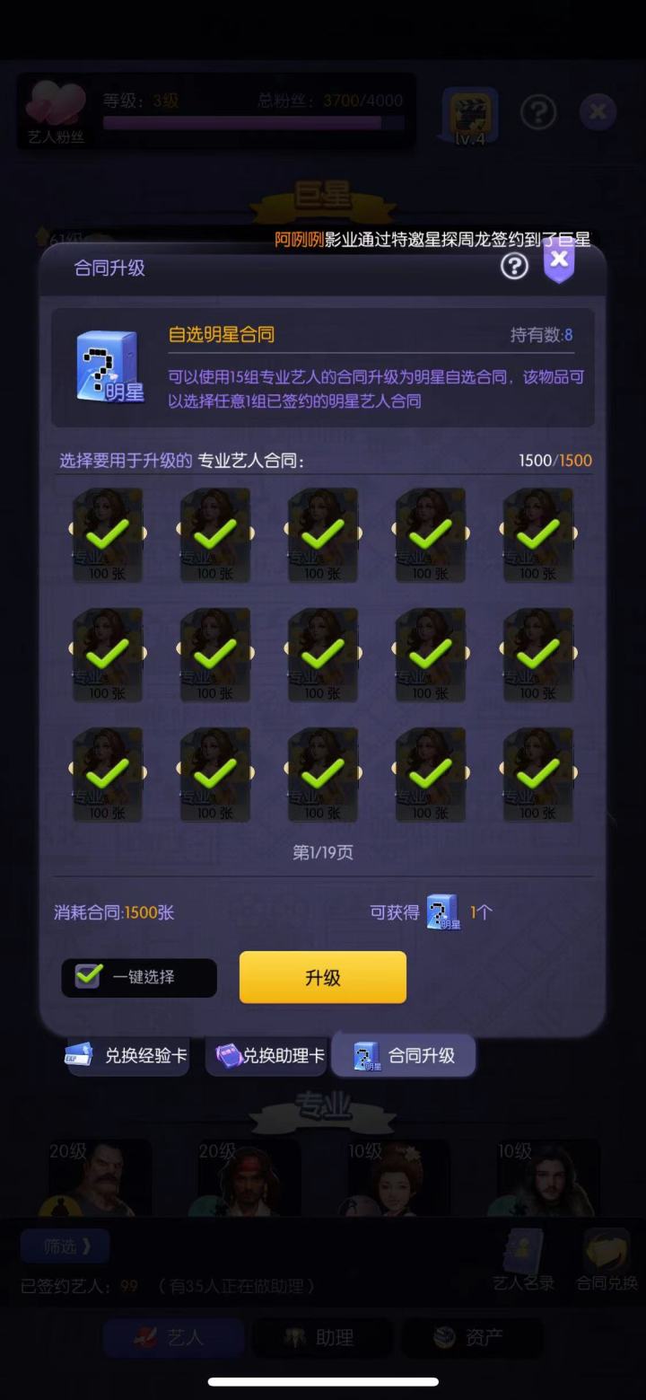 下面我们来讲下怎么兑换自选明星合同:大家点开艺人,最右下角有个合同兑换,可以兑换经验卡,助理卡,自选明星合同卡,一般来说所有普通的兑换经验卡,至于助理卡和自选明星合同卡,就得看各位实际需求了.
