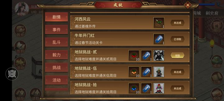 万人斩(之前一个10周普通档刷的):刘备,马超,张飞,关羽,马云禄,陈到,魏延,夏侯博,赵云,之前浮生和貂蝉的万人和五周地狱的成就奖励,在这次重开时一直没有,先吐槽一下。