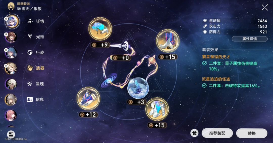 暴击的伤害感觉不是很高,输出基本是靠击破伤害打的,感觉可以不带暴击头。击破特攻非常关键,我这个面板炸一下都能有三万左右,并且量子击破可以推条,也是收到击破特攻的影响的。所以遗物推荐带速度,命中和击破特攻,球带攻击或者量子都行,两件套带公司来补攻击力(如果想让银狼当副c的话也是能换暴击衣服的,但是面板也就更难叠了)。缺点的话就是对群太弱了,这也是巡猎的弱势了。