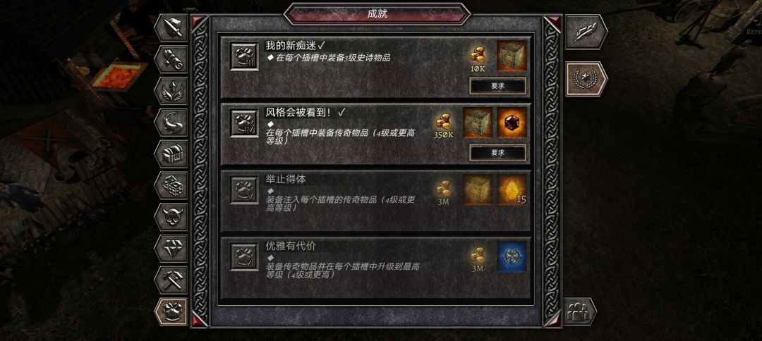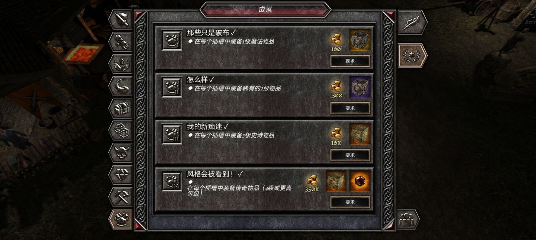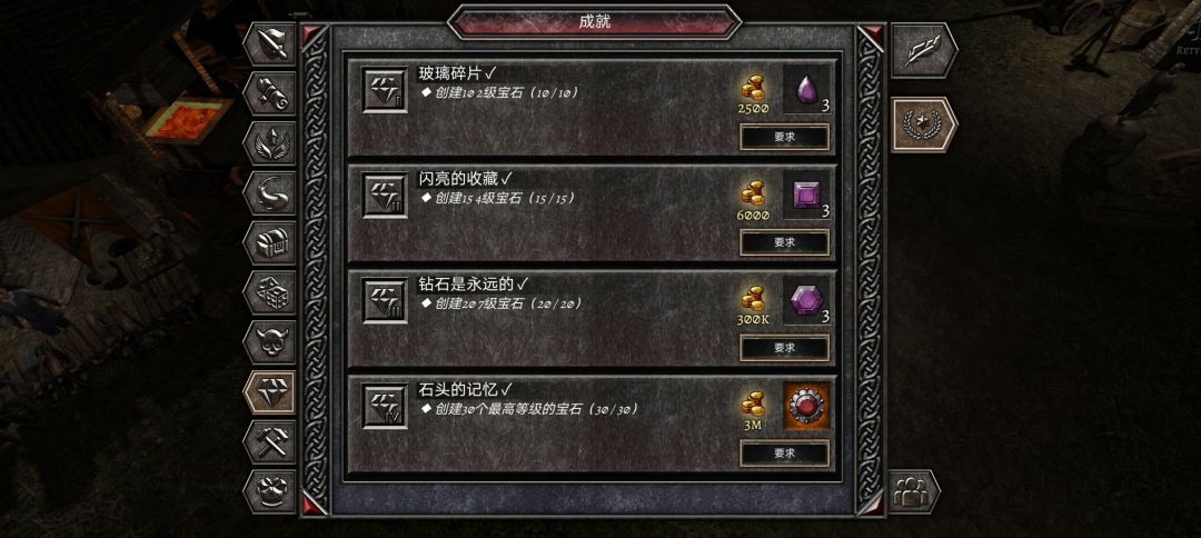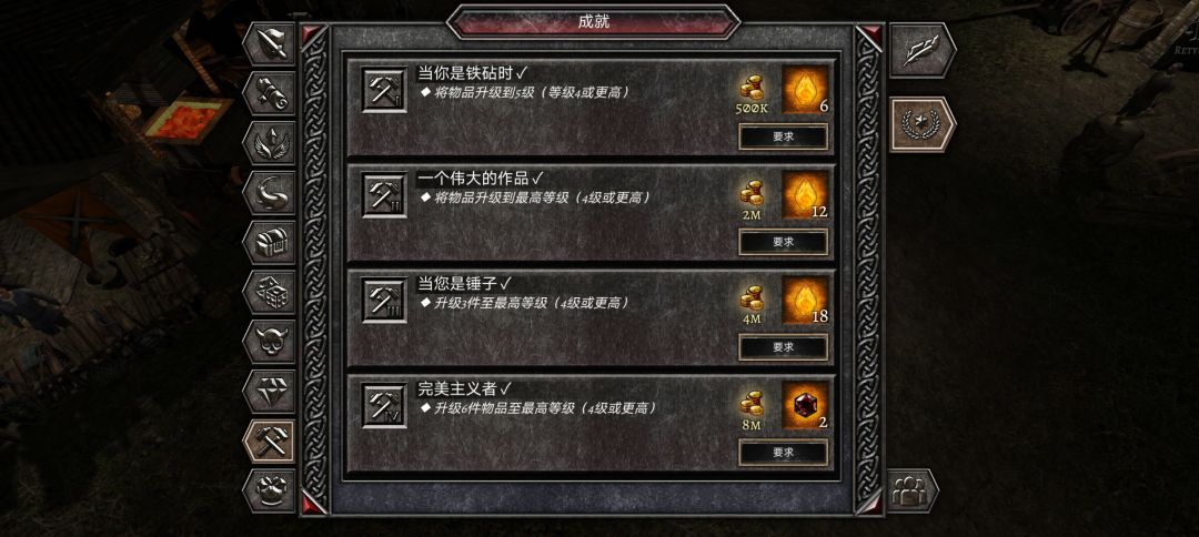 1是刷地狱难度赌黑市就行了,赌的钱数最少也要22万多才1次,赌一定数量就完成了;2、3是打一定怪物等级的数量就完成;4是合成宝石,前期打比合成低一阶的宝石合成到一定数量就行;5是铁匠强化,括号里最低要4阶装备,6件强化40级就完成了;6、7是一套10件装备,第1个是1阶一套蓝装,第2个是2阶一套金装,第3个是3阶一套紫装,第4个是4阶一套传说装备,第5个是4阶或4阶以上传奇装备全融合并强化到40级,第6个是4阶或4阶以上传奇装备全融合并强化到50级还要镶嵌最高级宝石,装备孔都开孔。