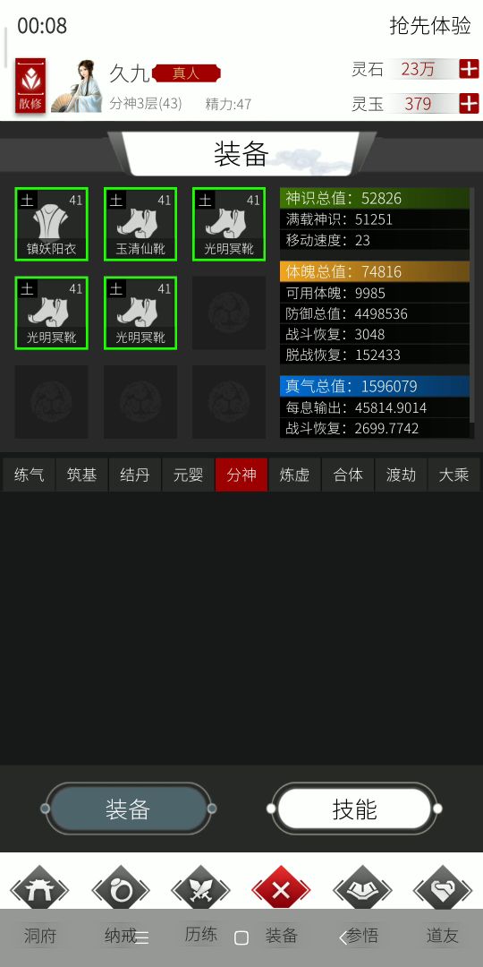 五灵根久九 450w防不吃药 1.6武器 经脉伤害加成1层满 0减伤渡分神3到4